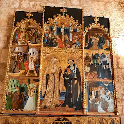 Este retablo atribuido por Gudiol al anónimo Maestro de la Visitacion, autor del documentado retablo (1466 - 1476)encargado por el canónigo Nadal Garcés procede de la Sala Capitular del claustro de la Catedral de Segorbe. Esta constituido por cinco grandes tablas de maderas exóticas, tal vez africana, lleva en la calle central la Visitacion de la Virgen a Santa Isabel con donante a los pies y el Calvario en la parte superior. En la calle lateral izquierda se puede observar de arriba a abajo San Bernardino y San Lucas y . en la derecha hay una santa mártir no identificada y un Santo Obispo tampoco identificado.